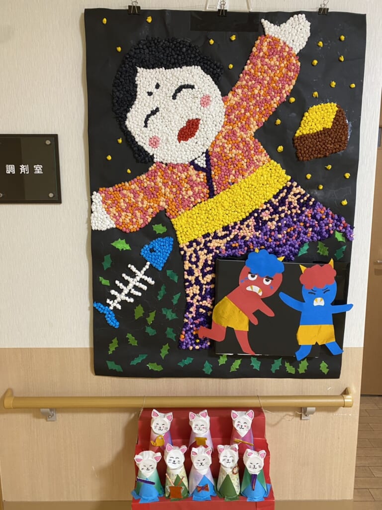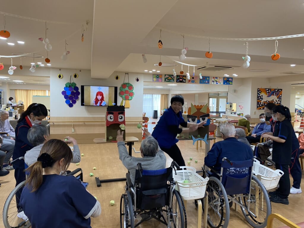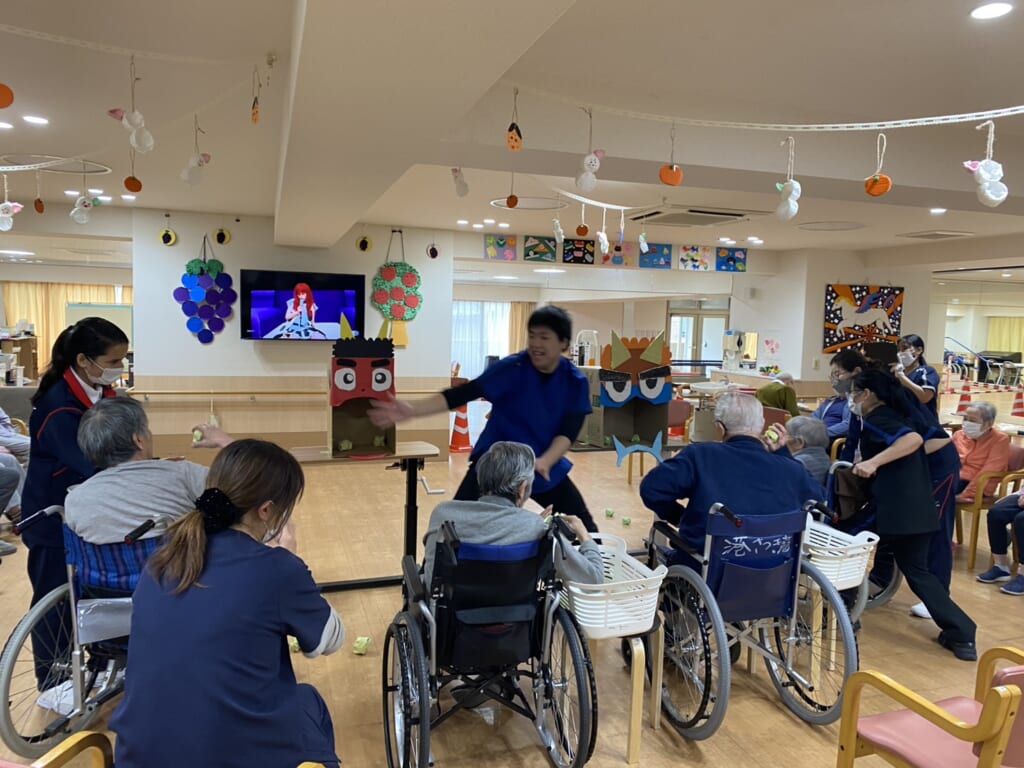 節分行事 ブログ 職員(鬼役)が右へ左へと邪魔をするので、 必死に豆を投げ入れ大盛り上がり! 汗だくになりながら笑いをとる鬼役に ご利用者様から「頑張れー!」と あたたかい声援が飛び交いました。 ブログ